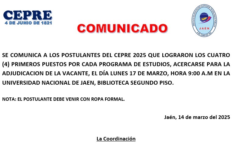 SE CITA A LOS INGRESANTES POR CEPRE 2025 A LA ADJUDICACIÓN DE VACANTE SEGÚN COMUNICADO.